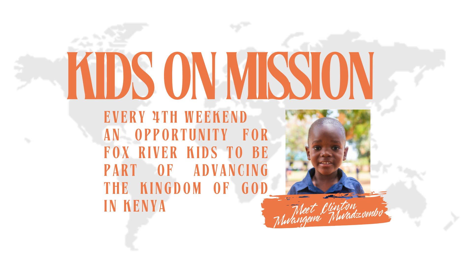 1. Sponsored Student – Fox River Kids is sponsoring Kenyan student, Clinton Mwangemi Mwadzombo! Every Sunday, each Fox Kids room will have a jar for Fox River Kids to donate to the sponsorship. Every 4th weekend of the month, classes will highlight our sponsorship & pray for Clinton as a class.