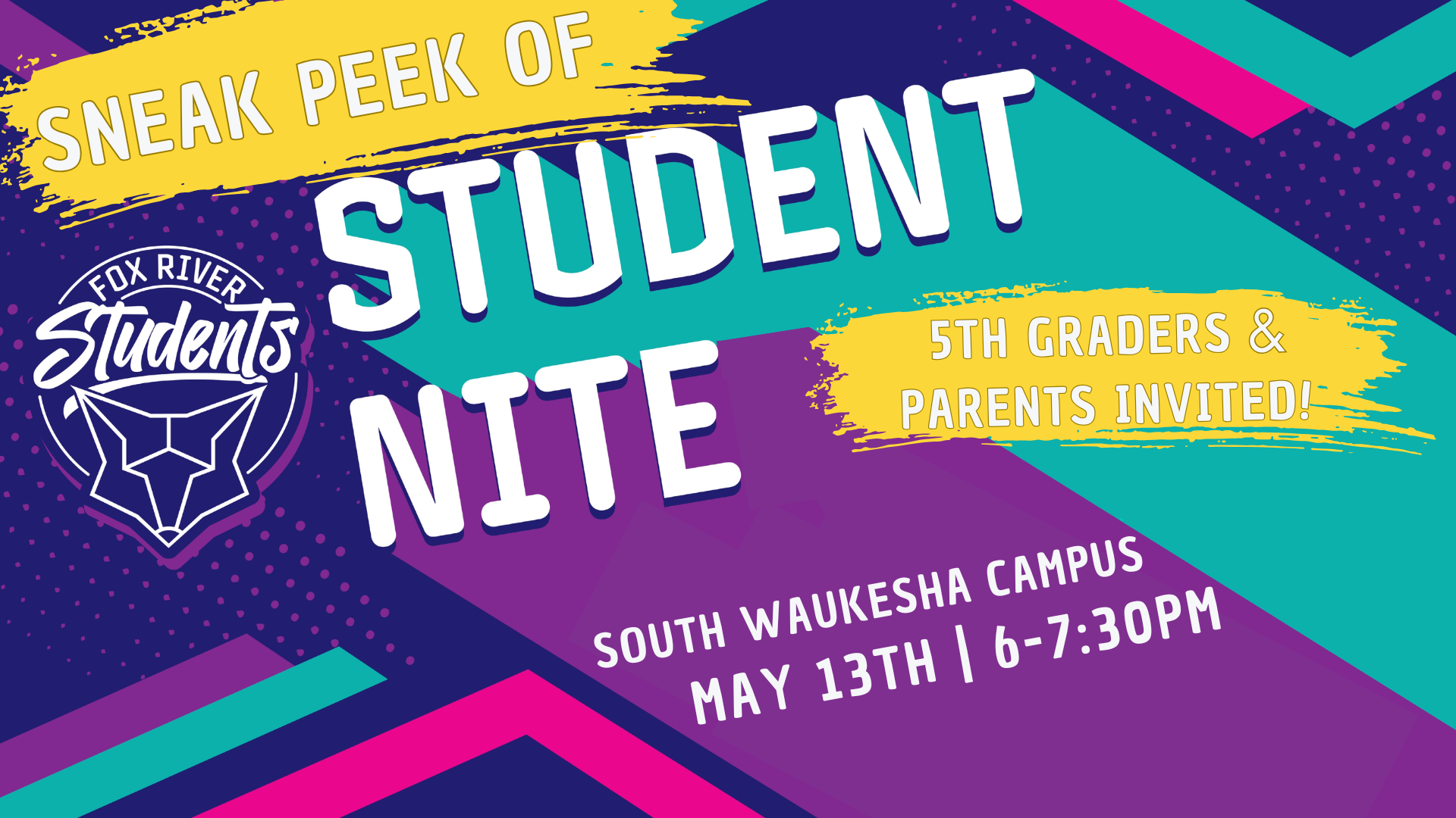 Students in 5th grade and their parents are invited to get a Sneak Peek of Student Nite before the new school year begins. This special evening is a chance to experience what Student Nite is all about, meet leaders, check out the environment, and see how students connect through worship, an engaging message, and small group discussions. Come get a feel for what Fox River Students looks like for 6th–12th graders and get excited for what’s ahead!